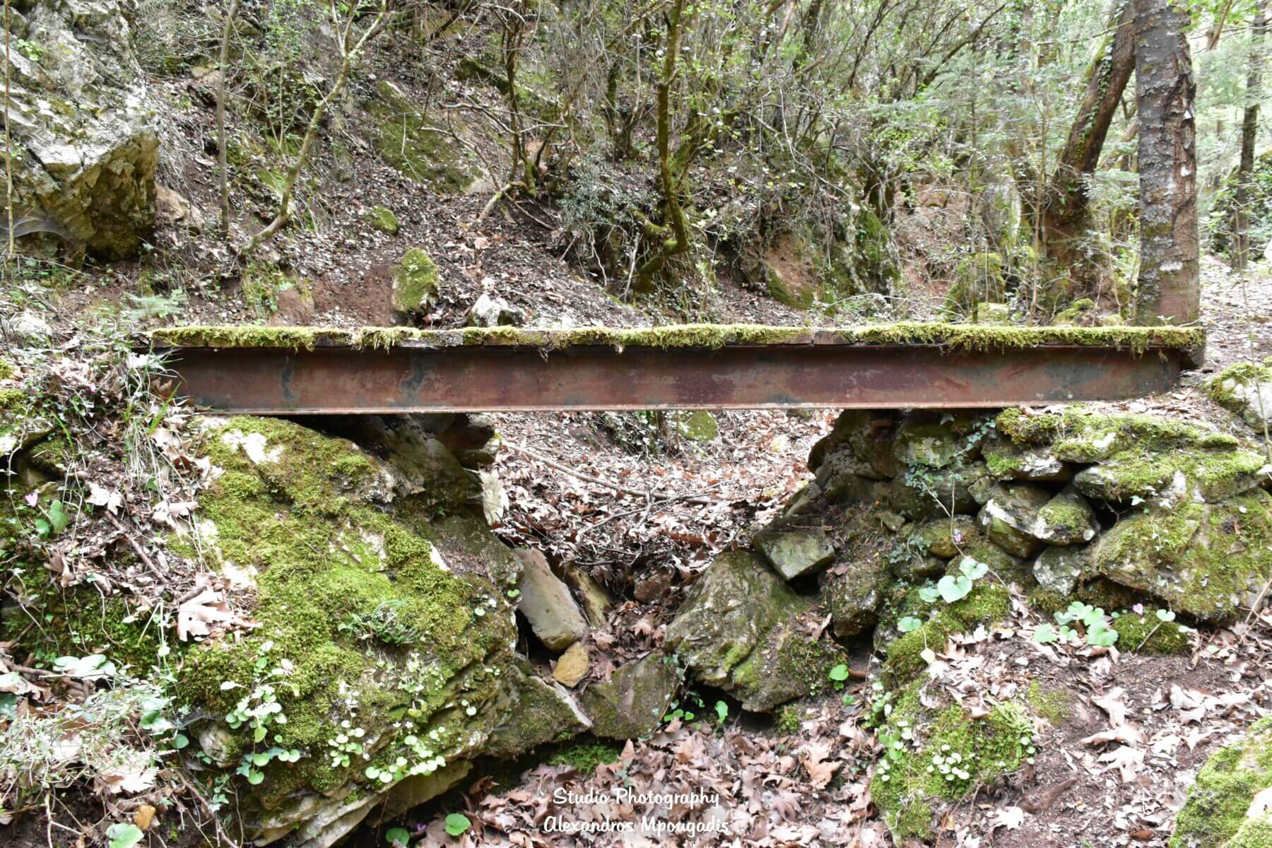 Το μονοπάτι κατηφορίζει προς τη ρεματιά της Ρασίνας, περνώντας μέσα από πλούσια βλάστηση και ακολουθώντας τη φυσική πορεία του νερού. Λίγο αργότερα συναντά ένα παλιό μονότοξο πέτρινο γεφύρι, που αποτελεί ένα από τα πιο χαρακτηριστικά σημεία της διαδρομής. Από εκεί, το μονοπάτι συνεχίζεται κατά μήκος μικρού παραπόταμου, ανάμεσα σε πλατάνια και αραιό δάσος.